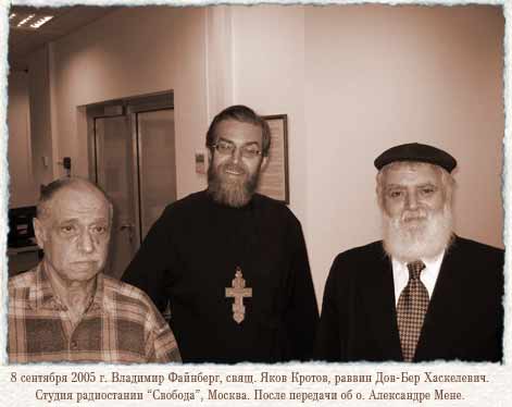 Александр Мень - еврей, русский интеллигент, православный христианин и священник. У нас сегодня в гостях бывший прихожанин отца Александра Меня, писатель, автор 16 книг Владимир Львович Файнберг, сейчас готовится к изданию его 17-ая книга "Словарь для Ники". И у нас гость из-за рубежа, из Америки, раввин Дов-Бер Хаскелевич, из Бруклина.